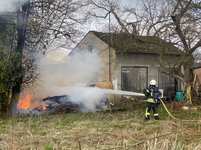 Auf einem Grundstück war gegen 14:20 Uhr Unrat im Bereich eines Garagengebäudes in Brand geraten. Die Feuerwehr nahm zur Brandbekämpfung ein C-Rohr unter Atemschutz vor und dämmte die Flammen schnell ein. Ein Übergreifen auf das angrenzende Garagengebäude sowie die Umgebung konnte so verhindert werden. Im Anschluss an die Löscharbeiten musste das Brandgut auseinandergezogen werden.