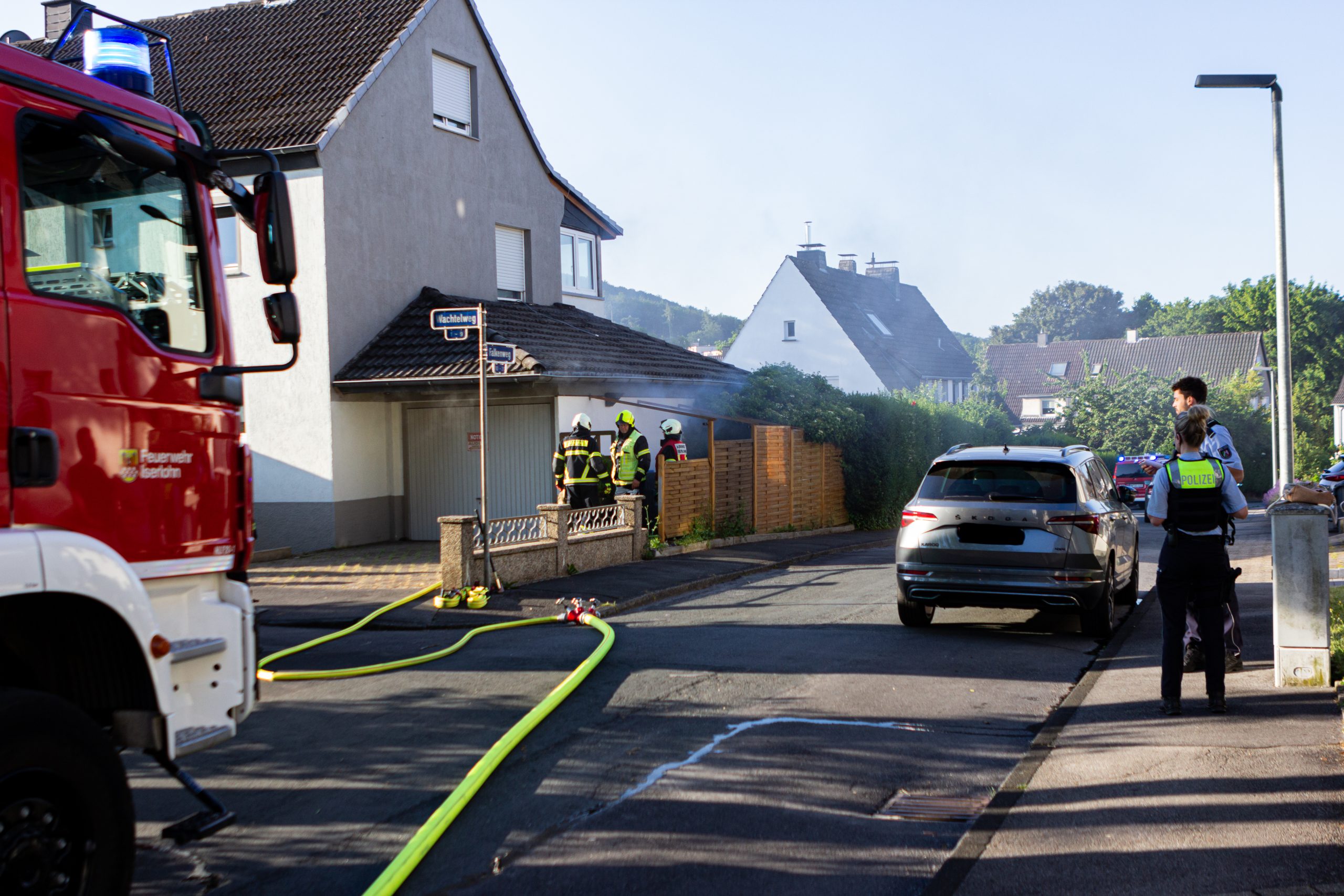 Iserlohn. (ots) Am frühen Sonntag morgen gegen 7:13 Uhr meldeten Anwohner vom Wachtelweg, das aus einer Garage Rauch austritt. Als die ersten Kräfte des Löschzuges der Berufsfeuerwehr eintrafen, bestätigte sich die gemeldete Lage soweit das aus dem Dachbereich der Garage Rauch austrat und der akustische Alarm von Heimrauchmeldern zu hören war. Zu diesem Zeitpunkt hatten bereits alle Bewohner das Haus …