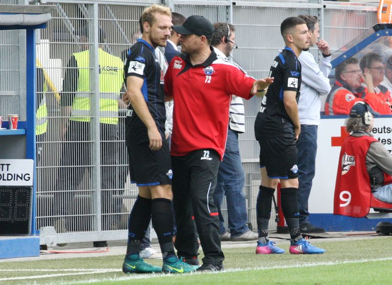 SCP Trainer Steffen Baumgart gibt an Sven Michel Anweisungen. – © by Sportstimme (MK)