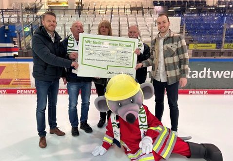 Iserlohn. (PM Stadtwerke) Als Heimatversorger ist es den Stadtwerken Iserlohn ein Anliegen, lokale Institutionen zu unterstützen. Am 10.01.2025 waren die Stadtwerke Iserlohn Trikotsponsor beim Heimspiel der Iserlohn Roosters. Die Trikots wurden im Anschluss für gleich zwei gute Zwecke versteigert. Der Erlös in Höhe von 1.406 Euro je Institution wurde jetzt feierlich auf dem Eis an Vertreter des Floriansdorf sowie Flaschenkinder …