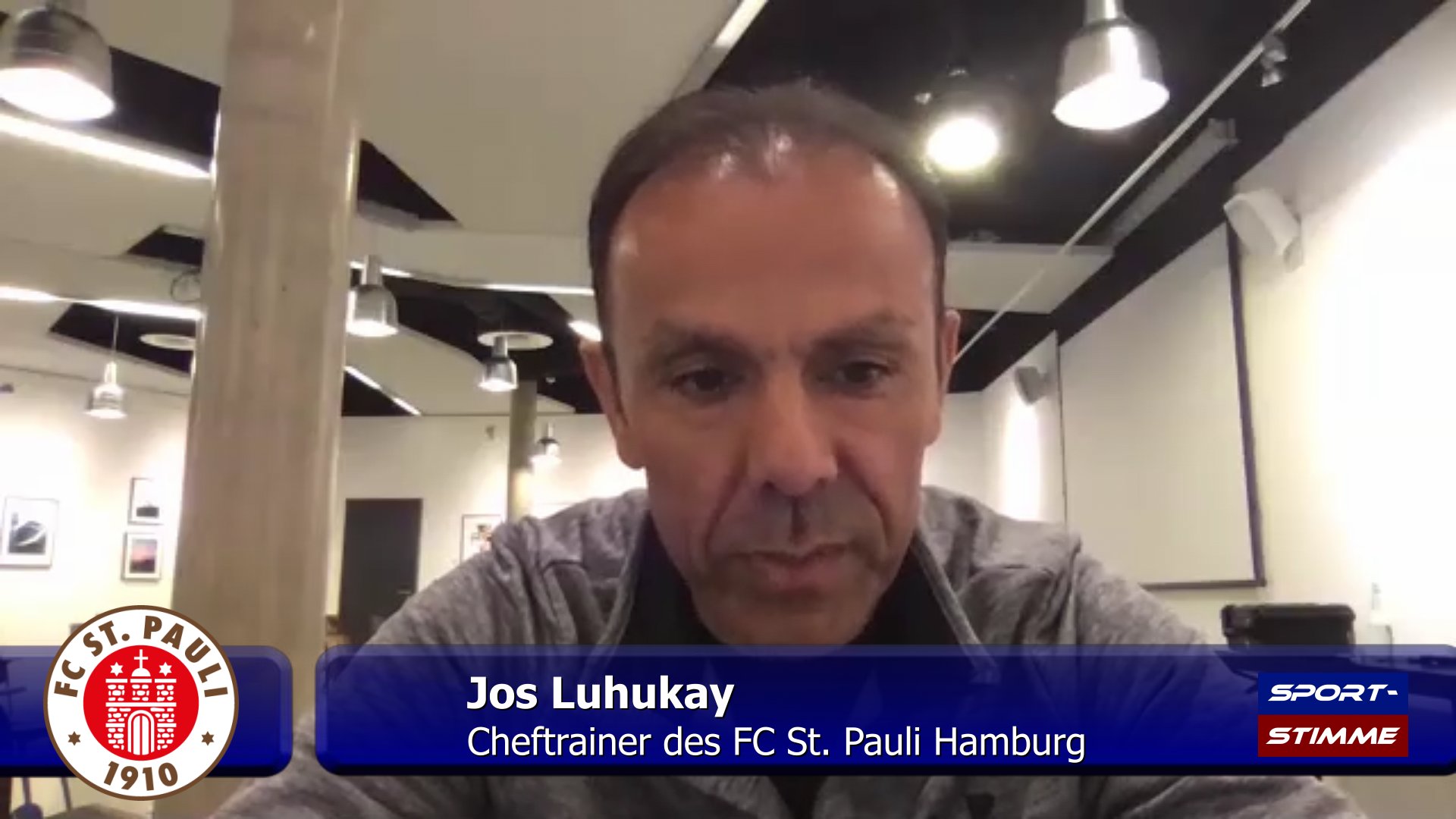 St. Paulis Coach Jos Luhukay stand im Teamhotel online Rede und Antwort – © Screenshot FC St. Pauli / Sportfoto-Sale 2020