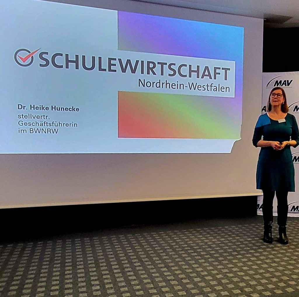 Einen weiteren inhaltlichen Schwerpunkt setzte Dr. Heike Hunecke (BWNRW / SCHULEWIRTSCHAFT NRW). Sie stellte die neue Handreichung zu Checklisten für Schülerbetriebspraktika vor und verdeutlichte anhand prägnanter Beispiele sowohl gelingende als auch misslingende Praktikumssituationen. Darüber hinaus präsentierte sie zentrale Angebote von SCHULEWIRTSCHAFT NRW. Dazu zählt die Mini-Phänomenta, ein seit vielen Jahren etabliertes MINT-Mitmachprojekt für Grundschulen, das Kindern an Experimentierstationen spielerisch naturwissenschaftliche Phänomene näherbringt. Der MAV unterstützt dieses Angebot aktiv, und insbesondere neue Schulen in der Region greifen es mit großer Begeisterung auf. Ergänzend stellte sie die MINT-Kinder-Welt vor, ein Konzept zur frühkindlichen MINT-Bildung, das pädagogischen Fachkräften praxisnahe Materialien und Impulse bietet. Zudem hob sie die Bedeutung der Demokratieförderung hervor – ein Themenfeld, das BWNRW seit Langem engagiert begleitet und das angesichts gesellschaftlicher Entwicklungen weiter an Relevanz gewinnt.