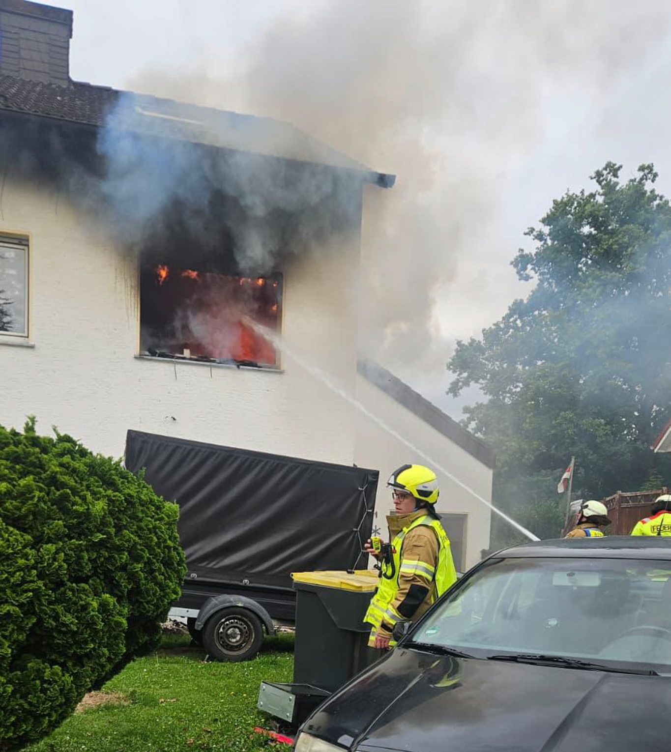 Als die Feuerwehr vor Ort eintraf, schlugen bereits Flammen aus einem Fenster im ersten Obergeschoss des Wohnhauses und drohten auf den darüberliegenden Dachbereich überzugreifen. Durch die schnelle Vornahme eines Strahlrohres von außen konnte gezielt Löschwasser in den Brandraum eingebracht werden, dies schlug die offenen Flammen nieder und verhinderte eine Ausbreitung auf die Traufe.