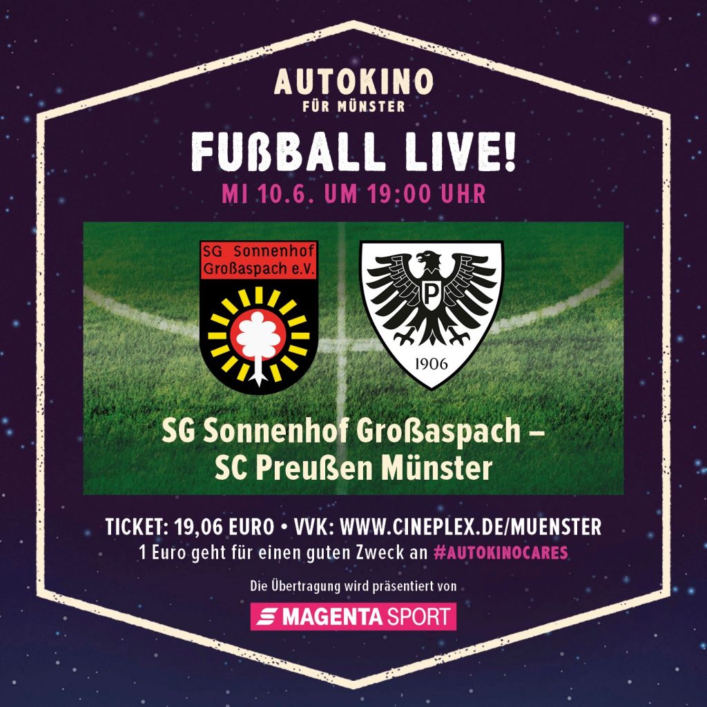 Münster. (PM Preußen) Ein Fußballspiel ohne Fans? Nicht mit uns! Deshalb bringen wir wieder zusammen, was zusammen gehört – auf Abstand. Gemeinsam mit unseren Partnern, dem Cineplex Münster und Magenta Sport, übertragen wir das Preußenspiel gegen Großaspach am 10. Juni (19 Uhr) LIVE im Autokino. Der Ticketvorverkauf beginnt am kommenden Montag (12:00) direkt über das Cineplex.